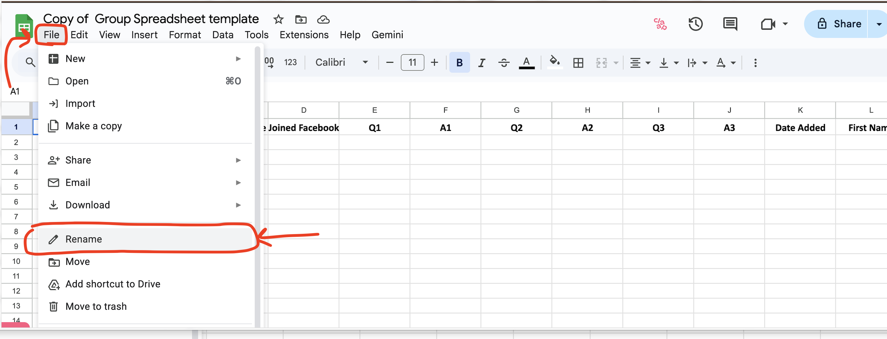 10. Click on File then Rename to rename your sheet